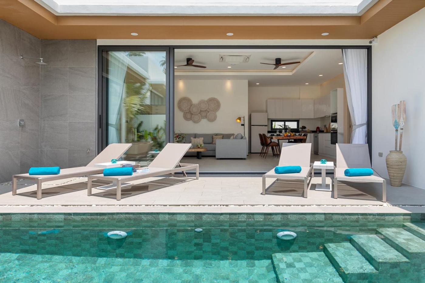 Three-Bedroom Villa. This villas standout feature is the private pool. Boasting a private entrance, this spacious villa also includes 3 bedrooms, a seating area and 3 bathrooms with a walk-in shower and a hairdryer. In the fully equipped kitchen, guests will find a stovetop, a refrigerator, a dishwasher and kitchenware. The air-conditioned villa offers a flat-screen TV with streaming services, a washing machine, a tea and coffee maker, a dining area as well as garden views. The unit has 3 beds.