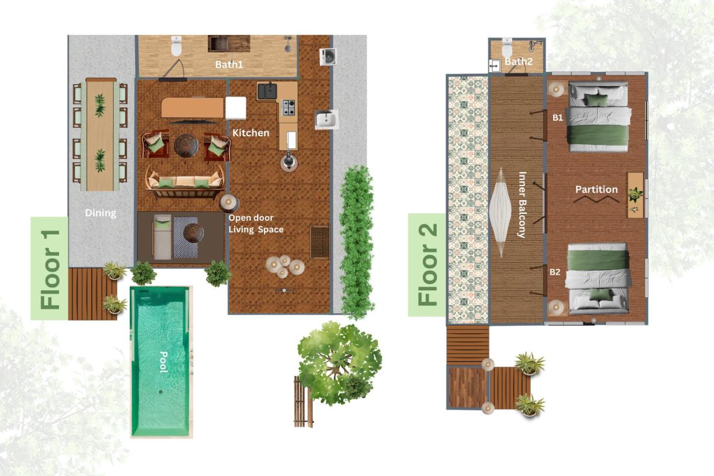 Two-Bedroom Villa. This villas standout feature is the private pool. Boasting a private entrance, this air-conditioned villa includes a kitchen, 2 bedrooms and 2 bathrooms with a bidet and a hairdryer. In the well-equipped kitchen, guests will find a stovetop, a refrigerator, kitchenware and a microwave. Featuring a terrace, this villa also offers a washing machine, a tea and coffee maker and a flat-screen TV. The unit has 2 beds.