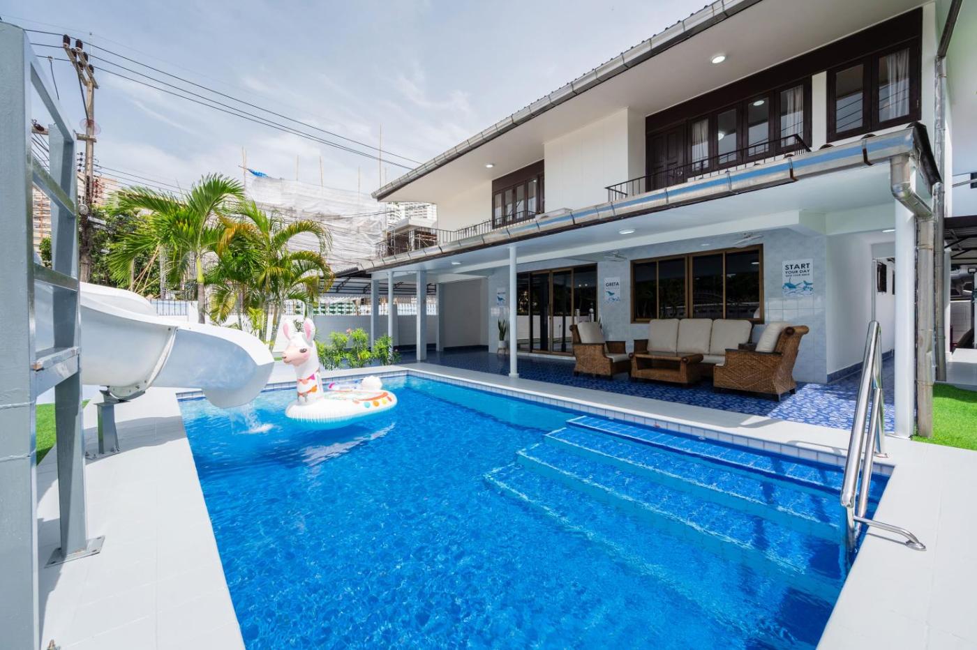 Greta Villa Pattaya ใกล้ชายหาด ใจกลางเมือง is a recently renovated villa in Pattaya North,guests can take a dip in its pool with a view and make the most of its free WiFi, private beach area and garden. This property offers access to a balcony and free private parking. The accommodation features a 24-hour front desk, a shared kitchen and luggage storage for guests.